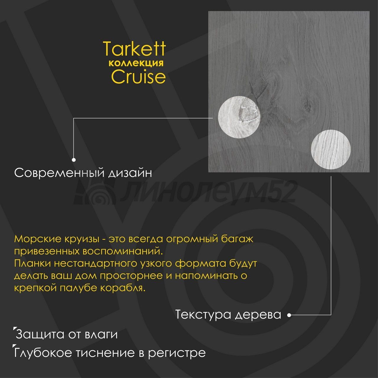 Ветер перемен наполняет парус мечты. Морские круизы - это всегда огромный багаж привезенных воспоминаний и впечатлений, наполненных незнакомыми запахами далеких стран и крепко просоленные морскими ветрами. Планки нестандартного узкого формата из коллекции "CRUISE 8/32 4V" будут делать ваш дом просторнее и напоминать о крепкой палубе корабля. Ламинат "TARKETT" представляет собой прочное многослойное напольное покрытие, состоящее из прессованного древесного волокна, пропитанных смолой слоев бумаги, и верхнего износостойкого покрытия. Верхний слой - тонкая сверхпрочная пленка, содержащая меламиновую (иногда акриловую) смолу. Если у вас остались вопросы, то наши специалисты с радостью помогут вам найти ответы по ламинату...