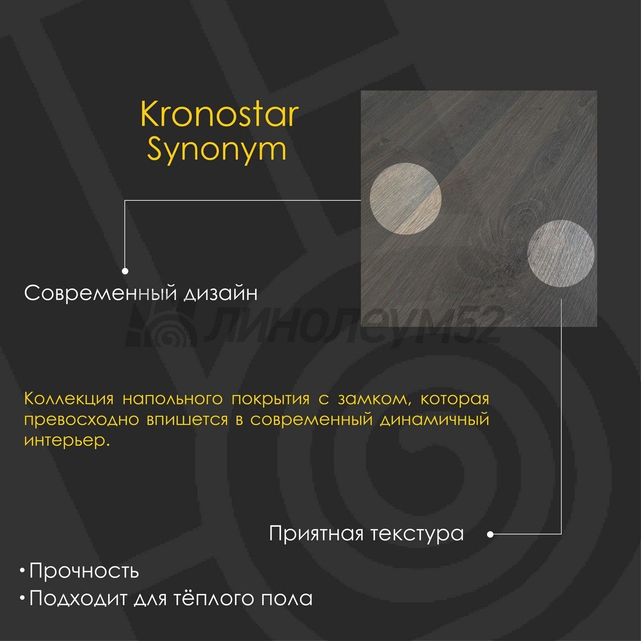 Ламинат Kronostar коллекция Synonym – напольное покрытие 33 класса износостойкости, в котором сочетаются экономичность и высокое качество. Поверхность ламината отлично передает текстуру натурального дерева. Благодаря системе Aquastop замок устойчив к воздействию влаги в течение 25 часов. Ламинат Kronostar Synonym будет служить верой и правдой, не теряя свой облик, Создавая уют и красоту, где каждый миг — твоя жизнь и стиль...