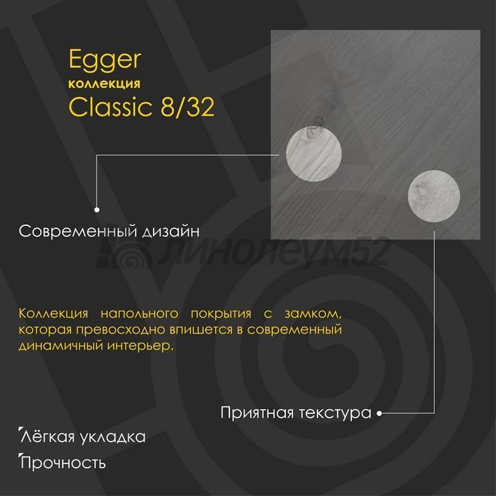 Ламинат - EGGER / PRO 2023 Ламинат 8/32 - CLASSIC / ВУД АШКРОФТ EPL039 от Egger - PRO 2023 Коллекция:: Classic 8/32 - Egger, Торговая марка:: Egger - PRO 2023, Тип товара:: Ламинат, Применение на покрытие:: Универсальное, Морозостойкость:: Отсутствует, Класс применения:: 32, Толщина: 8.00, Вид имитируемой древесины:: Дуб, Замковая система:: Click - IT, Влагостойкий / Реалистичное тиснение, Тип дизайна:: Классический ламинат, Допустимые зоны применения:: Выставочный стиль / Жилые помещения / Кабинеты / Торговые помещения, Страна производитель:: Россия, Устойчивость к химическим составам:: Средняя, Устойчивость к давлению мебели:: Средняя, Устойчивость к роликовым креслам:: Высокая, Класс пожарной опасности:: КМ3, Срок службы:: 20 лет, Способ укладки:: Диагональная / Прямая, Фаска:: Отсутствует, Уникальные свойства:: Высокая износоустойчивость покрытия / Подходит для пола с подогревом +27°С / Продажа товара отпускается в упаковках,