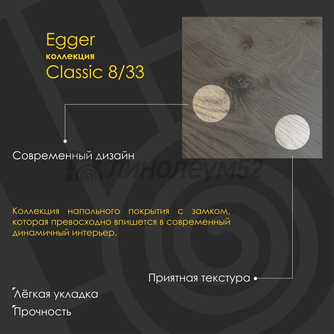 Ламинированные напольные покрытия "EGGER / PRO 2023" высококачественные, экологичные и всегда современные. Яркий рисунок древесины дуба, напоминающий дощатый пол, очень хорошо подходит для создания креативного дизайна интерьера. Наша современная разработка 2023 года не оставит покупателей равнодушными, ведь уникальное соотношение цены и качества превосходят любые ожидания. Изумительный ламинат "CLASSIC 8/33" можно использовать на полах с подогревом. Стоит также отметить, что нижний или основной слой, обеспечивает материалу лучшую прочность покрытия. Если у вас остались вопросы, то наши специалисты с радостью помогут найти ответы на каждый из них...