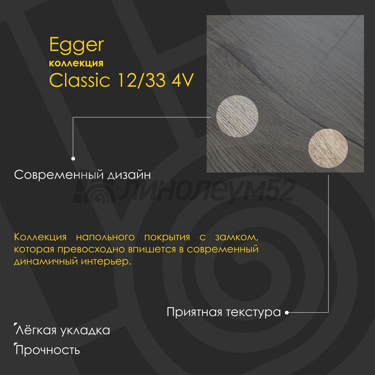 Ламинат "CLASSIC 12/33 4V" - изумительная коллекция в линейке стилей 2023 года. До этого момента "EGGER" еще никогда не выпускал ламинат толщиной 12 миллиметров. Время диктует свои правила и высокая популярность толстого ламината не оставила немецкого производителя в стороне, поэтому сегодня мы готовы представить вам 13 уникальных декоров с различными рисунками и цветовыми оттенками. 33 класс износоустойчивости свидетельствует о высоких эксплуатационных характеристиках напольного покрытия, что в свою очередь позволит использовать в помещениях с высокой нагрузкой...