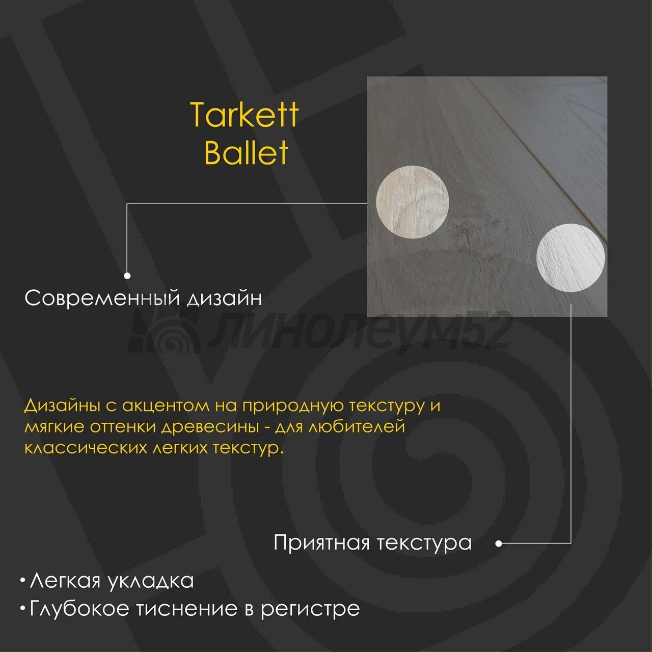 Ламинат - это прочное многослойное напольное покрытие, состоящее из прессованного древесного волокна, пропитанных смолой слоев бумаги, и верхнего износостойкого покрытия. Для любителей классических легких вкусов мы предлагаем новую коллекцию BALLET. В новой коллекции BALLET представлены классические дизайны с акцентами на природную текстуру и мягкие оттенки древесины, которые создадут в вашем доме комфортную и тёплую атмосферу. Tarkett находится в постоянном сотрудничестве с архитекторами, проектировщиками, дизайнерами и управляющими компаниями, стремясь сделать жизнь людей комфортнее. Tarkett предлагает решения для различного рода зданий, помещений и общественных зон. Широкая линейка продуктов (ПВХ покрытия, ламинат и паркет) и большой выбор уникальных дизайнов. Элегантность и престиж в каждой детали ламината...