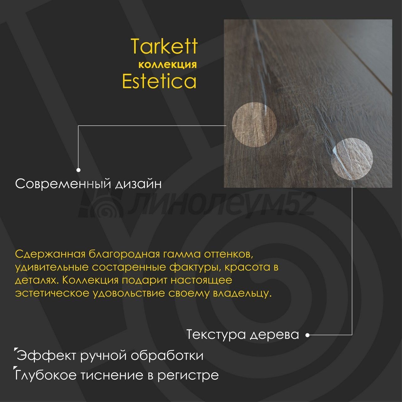 Коллекция "ESTETICA 9/33 4V" - создана нашими дизайнерами для самых искушенных. Сдержанная благородная гамма оттенков, удивительные состаренные фактуры, красота в деталях, эстетика соблазна в каждой линии. Ламинированное напольное покрытие "ESTETICA 9/33 4V" - это рождение чувственного восприятие мира, которое дарит настоящее эстетическое удовольствие своему владельцу. "TARKETT" находится в постоянном поиске и сотрудничестве с архитекторами, проектировщиками, дизайнерами и управляющими компаниями, стремясь сделать жизнь людей комфортнее. Обладая огромным выбором напольных покрытий, "TARKETT" предлагает решения для различного рода зданий, помещений и общественных зон. Широкая линейка продуктов (ПВХ-покрытия, ламинат, паркет) и большой выбор дизайнов позволят создать свой неповторимый стиль. "TARKETT" - это совершенный ламинат для дома...