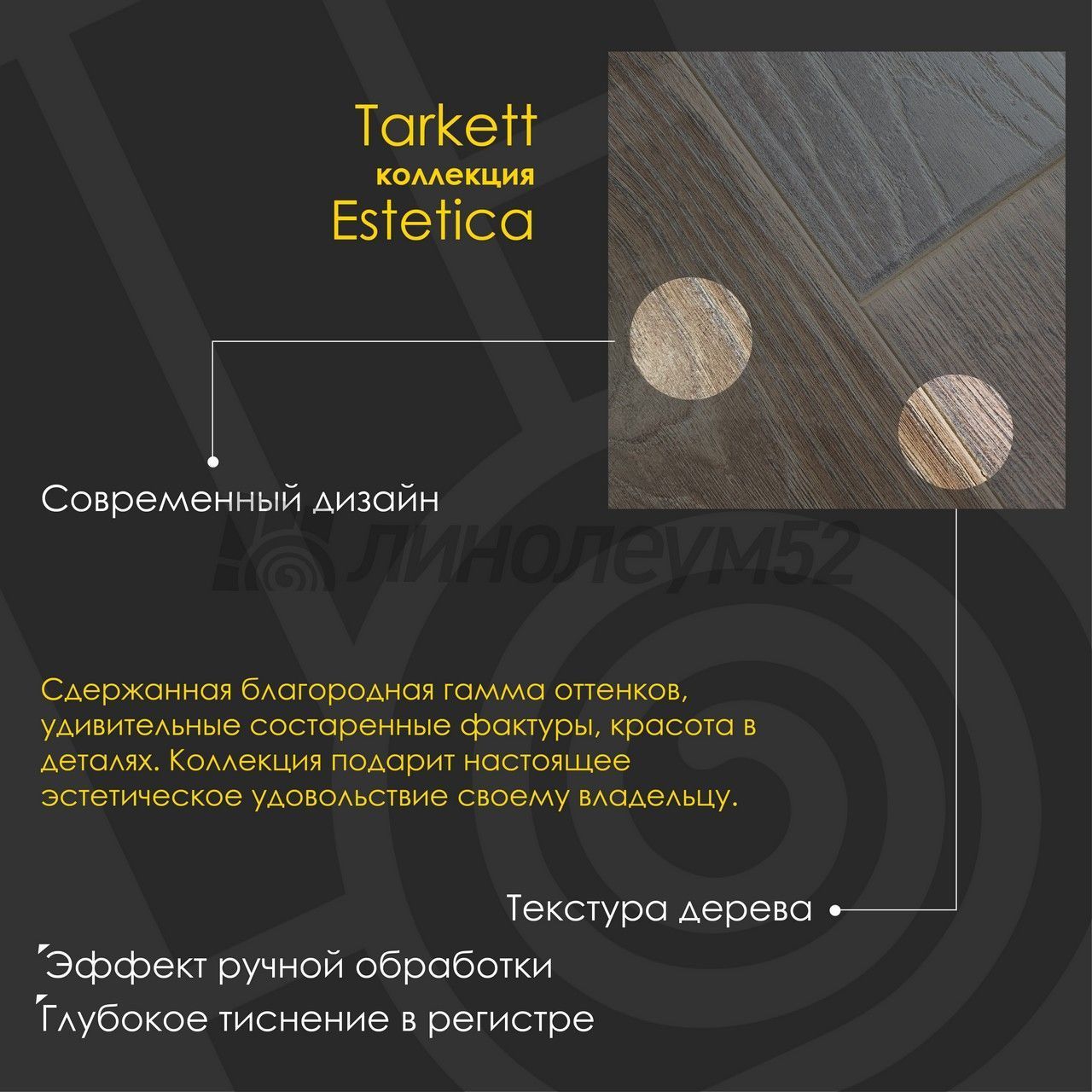 Коллекция "ESTETICA 9/33 4V" - создана нашими дизайнерами для самых искушенных. Сдержанная благородная гамма оттенков, удивительные состаренные фактуры, красота в деталях, эстетика соблазна в каждой линии. Ламинированное напольное покрытие "ESTETICA 9/33 4V" - это рождение чувственного восприятие мира, которое дарит настоящее эстетическое удовольствие своему владельцу. "TARKETT" находится в постоянном поиске и сотрудничестве с архитекторами, проектировщиками, дизайнерами и управляющими компаниями, стремясь сделать жизнь людей комфортнее. Обладая огромным выбором напольных покрытий, "TARKETT" предлагает решения для различного рода зданий, помещений и общественных зон. Широкая линейка продуктов (ПВХ-покрытия, ламинат, паркет) и большой выбор дизайнов позволят создать свой неповторимый стиль. "TARKETT" - это совершенный ламинат для дома...