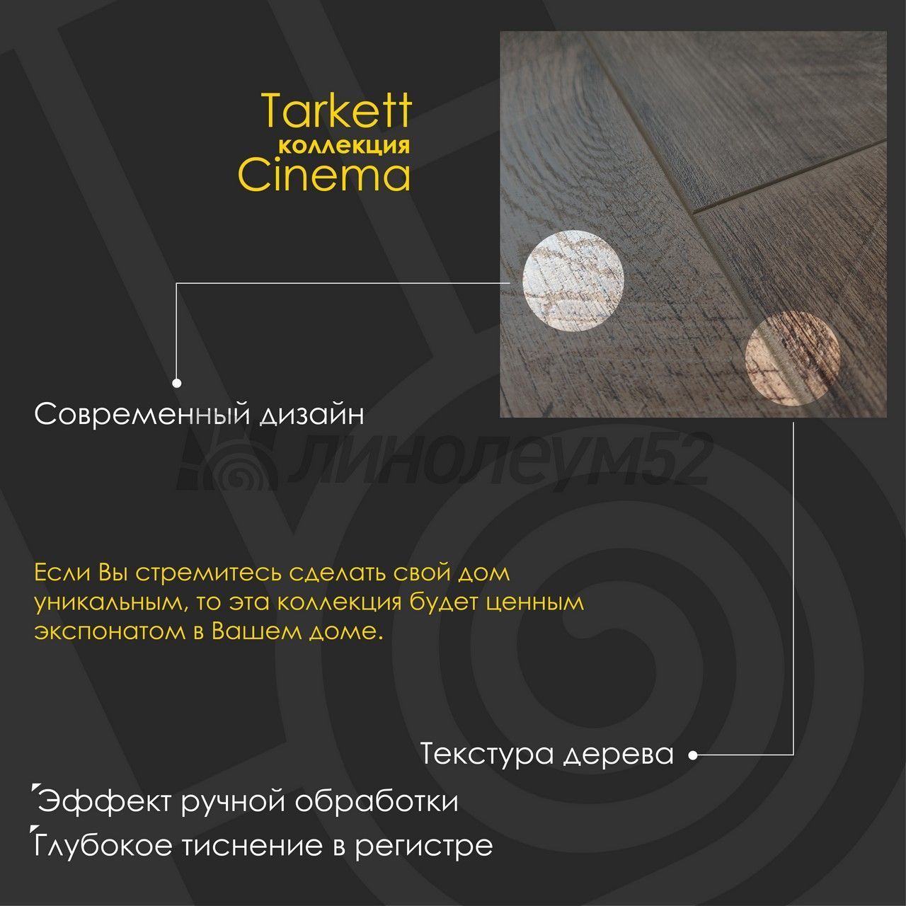 Винтажными могут именоваться только предметы, проверенные временем. "CINEMA 8/32 4V" - самое высокое качество, натуральный материал, уникальность и благородство форм. Если вы стремитесь сделать свой дом уникальным, ведь если вы коллекционер прекрасного, будь то старые фильмы или редкие вещи, то это коллекция будет ценным экспонатом в вашем доме. "TARKETT" предлагает каждому уникальное сочетание функциональности, стиля и комфорта для любых офисов и административных помещений. Многообразие коллекций позволяет воссоздать неповторимый дизайн, определяющий имидж каждой компании и способствующий формированию позитивной и продуктивной обстановки в офисе или вашем доме. Если у вас ещё остались вопросы, то наши специалисты без проблем помогут...