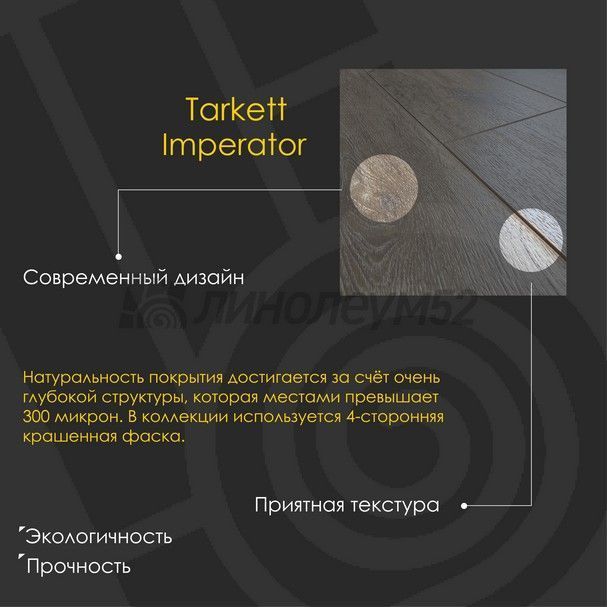 Представляем вам новую коллекцию ламината IMPERATOR. Натуральность покрытия достигается за счёт очень глубокой структуры, которая местами превышает 300 микрон. Мы создаём супер-глубокое тиснение, придающее дизайну особую эстетическую привлекательность и выразительность. Максимальная устойчивость к истиранию АС6 на 42% превышает показатели продуктов с 33-м классом применения. В коллекции IMPERATOR используется 4-сторонняя крашенная фаска. Толщина 8 мм. Ширина планки – наиболее популярная: 194 мм. "TARKETT" всегда предлагает решения для различного рода зданий, помещений и общественных зон. Широкая линейка наших продуктов (ПВХ-покрытия, ламинат и паркет) и большой выбор уникальных дизайнов. "TARKETT" - это лучшее качество...