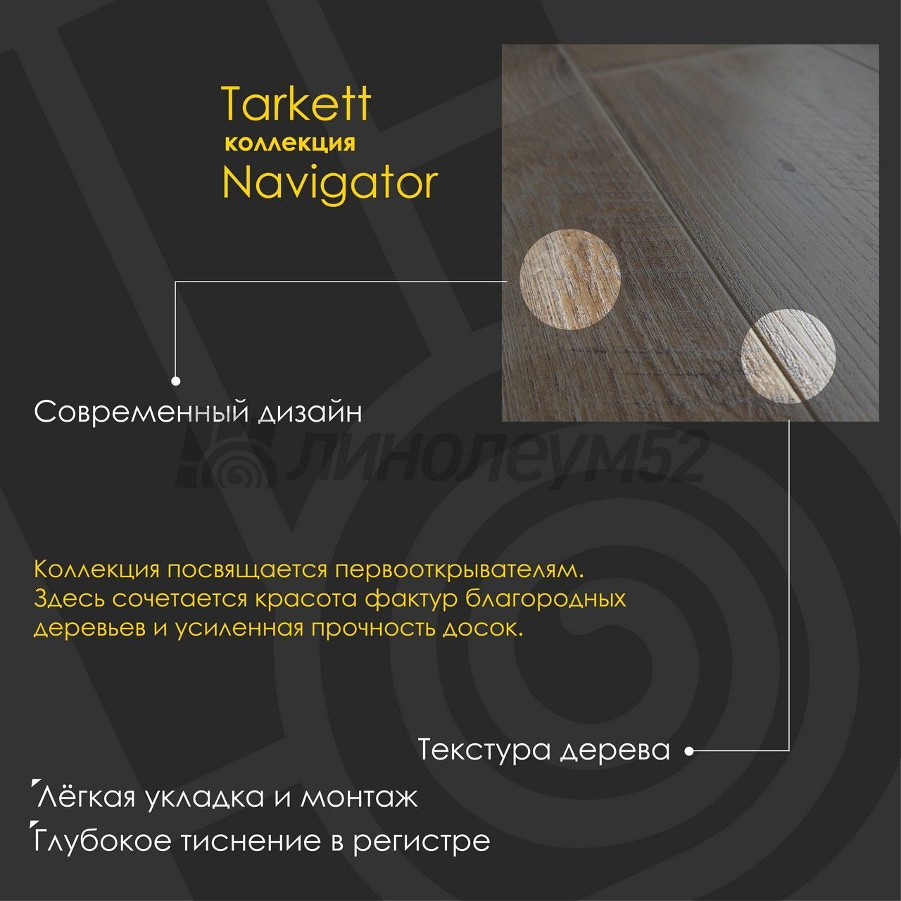 Коллекция "NAVIGATOR 12/33 4V" - это наше посвящение первооткрывателям, людям, сильным духом, пытливым, умным. В этой коллекции сочетается красота фактур благородных деревьев и усиленная прочность досок. Дом надежный и крепкий, а за порогом - манящая неизвестность, полная тайн и удивительных открытий. Ветер странствий уже прикоснулся к парусу мечты. Сердце рвется творить историю, руки крепче сжимают штурвал. Отдать швартовый, ведь мы держим курс на приключения. "TARKETT" находится в постоянном сотрудничестве с архитекторами, проектировщиками, дизайнерами и управляющими компаниями, стремясь сделать жизнь людей комфортнее. Имея огромный выбор напольных покрытий, "TARKETT" предлагает решения для различного рода зданий, помещений и общественных зон. Широкая линейка продуктов (ПВХ-покрытия, ламинат и паркет) и выбор дизайнов...
