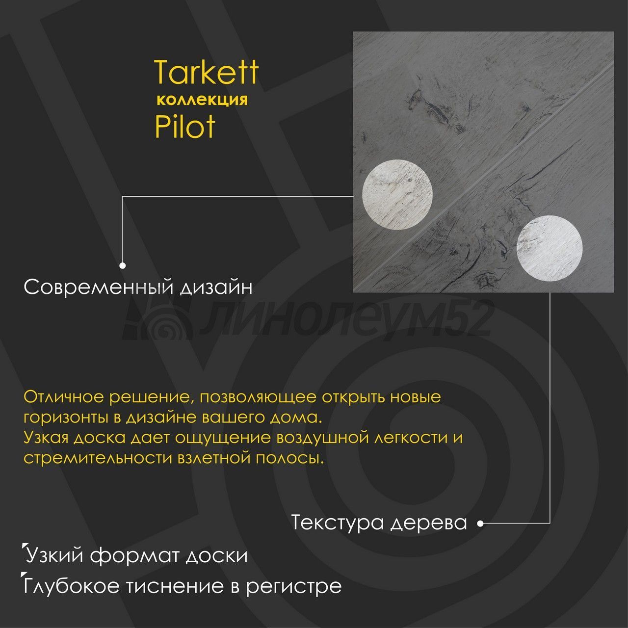 Чтобы летать быстрее всех, нужно летать быстрее себя. Поэтому мы изменили правила! Коллекция "PILOT 10/33 4V" - это новаторское решение, позволяющее открыть новые горизонты в дизайне вашего дома. Узкая доска дает ощущение воздушной легкости и стремительности взлетной полосы. "TARKETT" находится в постоянном сотрудничестве с архитекторами, проектировщиками, дизайнерами и управляющими компаниями, стремясь сделать жизнь людей комфортнее. Имея огромный выбор напольных покрытий, "TARKETT" предлагает решения для различного рода зданий, помещений и общественных зон. Широкая линейка продуктов (ПВХ-покрытия, ламинат, паркет) и большой выбор дизайнов позволят создать индивидуальный стиль для каждого интерьера. Если у вас остались вопросы, то наши специалисты с радостью помогут вам найти ответы на них. Готовим взлётную полосу...