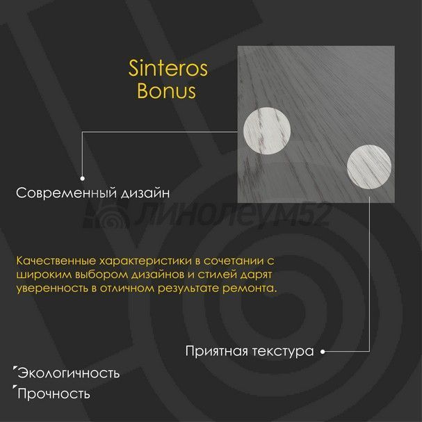 Бренд "SINTEROS" является одним из лидеров на рынке линолеума в России уже на протяжении многих лет. Такое стабильное положение бренд занимает благодаря объективным факторам, среди которых - постоянно совершенствующиеся технологии производства и эксплуатационные характеристики напольных покрытий. Ассортимент бренда "SINTEROS" включает линолеум, а также паркетную доску и ламинат популярных дизайнов. В 2015 году ПВХ-покрытия бренда "SINTEROS" стали обладателем Свидетельства о соответствии высшему уровню качества - "ЗОЛОТОЙ ЗНАК КАЧЕСТВА XXI ВЕКА". Получение такого свидетельства - это дополнительная оценка и подтверждение стремлений компании предлагать качественные, безопасные решения и быть ближе к нашим потребителям. Если у вас остались вопросы, то наши специалисты с радостью помогут найти ответы и примут любой вызов...