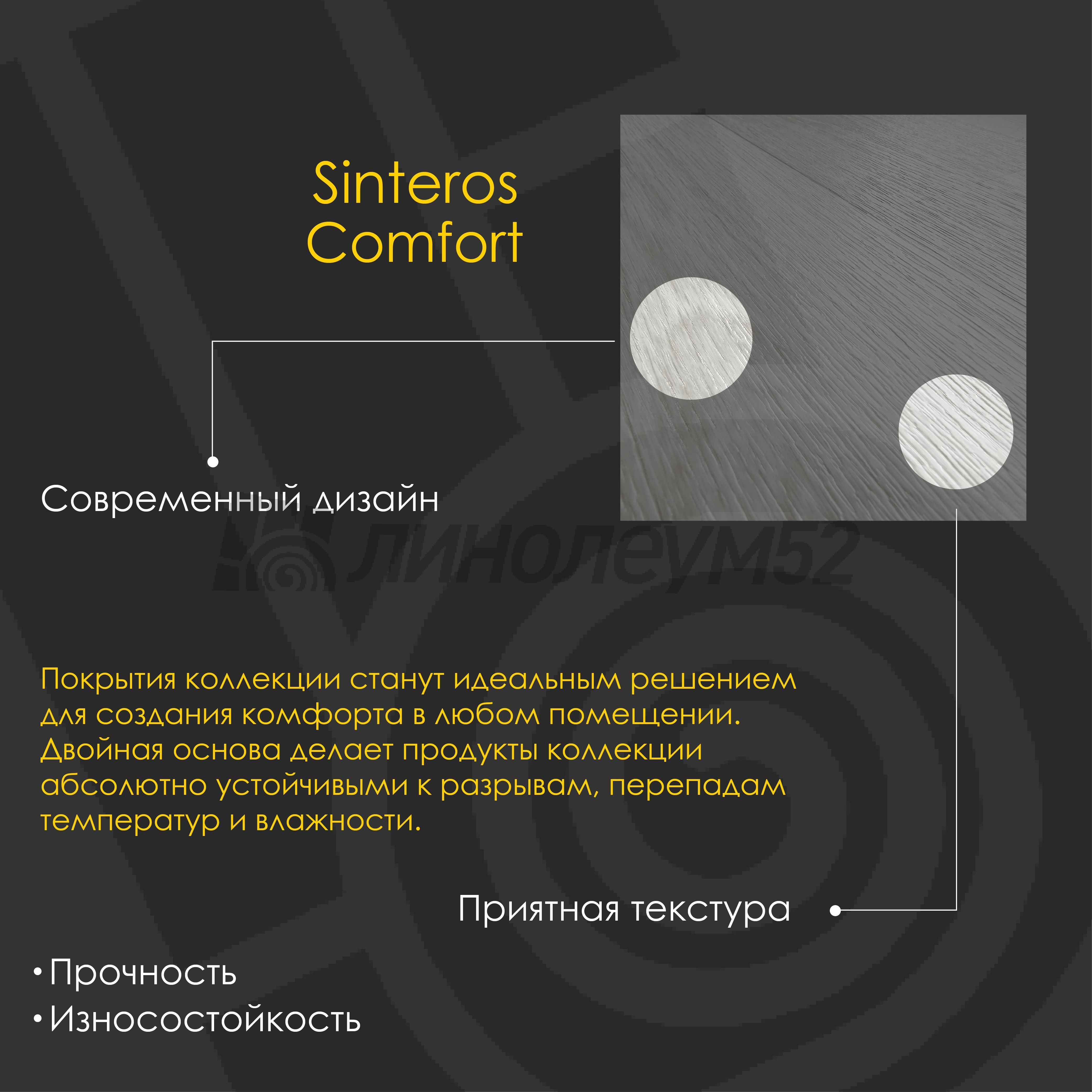 Бренд "SINTEROS" является одним из лидеров на рынке линолеума в России уже на протяжении многих лет. Такое стабильное положение бренд занимает благодаря объективным факторам, среди которых - постоянно совершенствующиеся технологии производства и эксплуатационные характеристики напольных покрытий. Ассортимент бренда "SINTEROS" включает линолеум, а также паркетную доску и ламинат популярных дизайнов. В 2015 году ПВХ-покрытия бренда "SINTEROS" стали обладателем Свидетельства о соответствии высшему уровню качества - "ЗОЛОТОЙ ЗНАК КАЧЕСТВА XXI ВЕКА". Получение такого свидетельства - это дополнительная оценка и подтверждение стремлений компании предлагать качественные, безопасные решения и быть ближе к нашим потребителям. Если у вас остались вопросы, то наши специалисты с радостью помогут найти ответы и примут любой вызов...