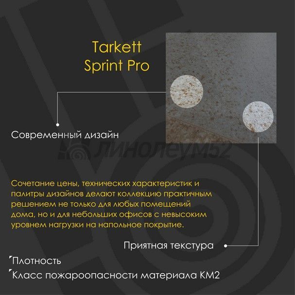 Удачное сочетание цены, технических характеристик и палитры дизайнов делают "SPRINT PRO" по настоящему практичным решением не только для любых помещений дома, но и для небольших офисов с невысоким уровнем нагрузки на напольное покрытие. А одна из самых широких в ассортименте бренда "TARKETT" линейка ширин позволяет легко подобрать нужный вариант для конкретного помещения, обеспечивая одновременно реализацию идеи дизайнера в помещении и экономичность...