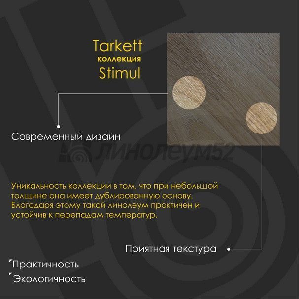 Уникальность коллекции в том, что при небольшой толщине она имеет двойную основу (пену и полиэстер). Благодаря этому "STIMUL" практичен и устойчив к перепадам температур. "TARKETT" находится в постоянном сотрудничестве с архитекторами, проектировщиками, дизайнерами и управляющими компаниями, стремясь сделать жизнь людей комфортнее. Обладая огромным выбором напольных покрытий, компания "TARKETT" - всегда предлагает решения для разных типов помещений...