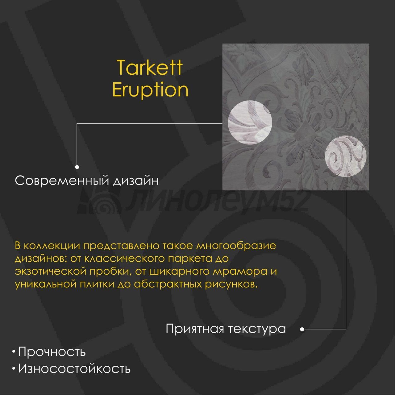 "ERUPTION" - это разнообразие возможностей. Напольные покрытия - это важная часть дизайна любого помещения. И это не случайно, ведь одна и та же комната будет выглядеть совершенно по-разному с деревянным, плиточным или текстильным полом. Именно поэтому в коллекции "ERUPTION" представлено такое многообразие дизайнов. Настоящее разнообразие возможностей в создании собственного, уникального интерьера дома! "ERUPTION" (Эрапшен) - это коллекция линолеума полукоммерческого назначения от лидера по производству напольных покрытий международной группы компаний "TARKETT". Благодаря применению дополнительного защитного слоя "TITAN" линолеум особо устойчив к воздействию на него ножек мебели и каблуков, а также роликовых кресел...