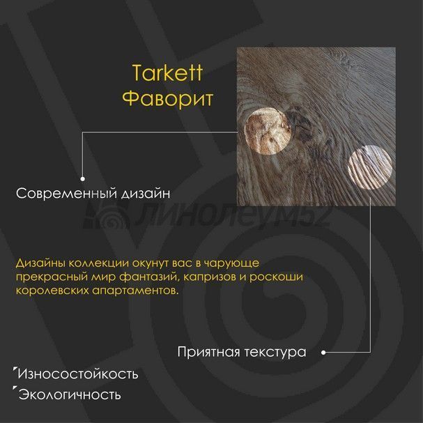Уникальные свойства: Высокая износоустойчивость покрытия / Дизайн представлен в разных ширинах / Подходит для пола с подогревом +27°С / Уникальный стиль / Экологичность / Экономичный выбор для покупателей