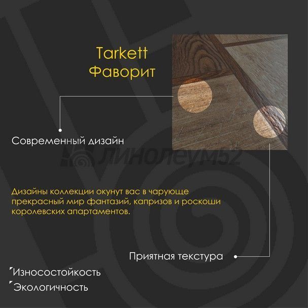 Великолепные классические дизайны дворцового паркета, сложно тонированное палубное дерево и смелые орнаменты дизайнов коллекции "ФАВОРИТ" окунут вас в прекрасный мир фантазий, капризов и роскоши королевских апартаментов. Закройте глаза, прикоснитесь к этому полу и перенеситесь в эту иную, запретную реальность. Обращаем ваше внимание на отличное покрытие от компании "TARKETT". Если у вас остались вопросы, то наши специалисты с радостью помогут найти ответы на каждый из них...