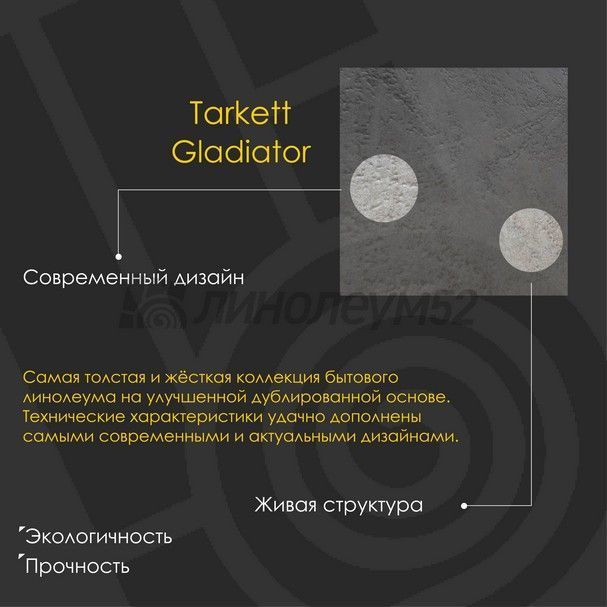 "GLADIATOR" - это самая толстая и жёсткая коллекция бытового линолеума на улучшенной дублированной основе в ассортименте "TARKETT". Широкая линейка продуктов (ПВХ-покрытия, а ещё ламинат и паркет) и большим выбором дизайнов позволят создать индивидуальный стиль для каждого интерьера. "TARKETT" находится в постоянном сотрудничестве с архитекторами, проектировщиками и дизайнерами, а также управляющими компаниями, стремясь принести комфорт в любые помещения...