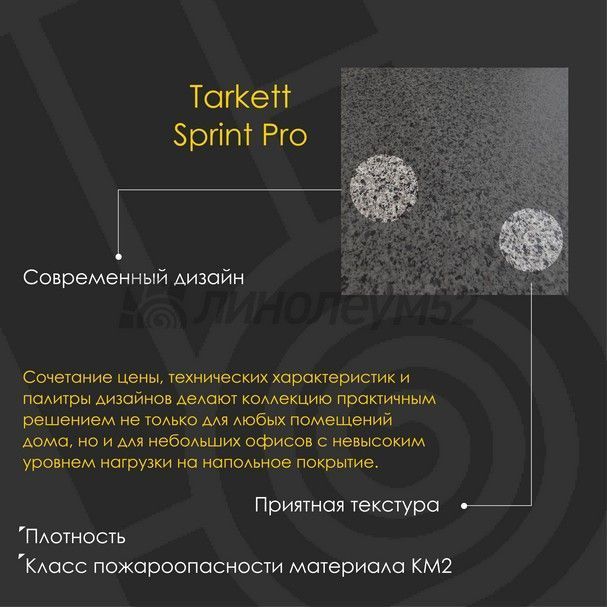 Удачное сочетание цены, технических характеристик и палитры дизайнов делают "SPRINT PRO" по настоящему практичным решением не только для любых помещений дома, но и для небольших офисов с невысоким уровнем нагрузки на напольное покрытие. А одна из самых широких в ассортименте бренда "TARKETT" линейка ширин позволяет легко подобрать нужный вариант для конкретного помещения, обеспечивая одновременно реализацию идеи дизайнера в помещении и экономичность...