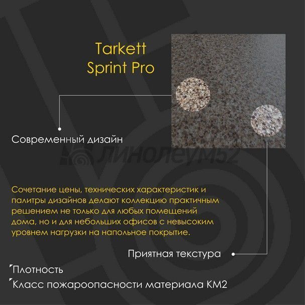 Удачное сочетание цены, технических характеристик и палитры дизайнов делают "SPRINT PRO" по настоящему практичным решением не только для любых помещений дома, но и для небольших офисов с невысоким уровнем нагрузки на напольное покрытие. А одна из самых широких в ассортименте бренда "TARKETT" линейка ширин позволяет легко подобрать нужный вариант для конкретного помещения, обеспечивая одновременно реализацию идеи дизайнера в помещении и экономичность...
