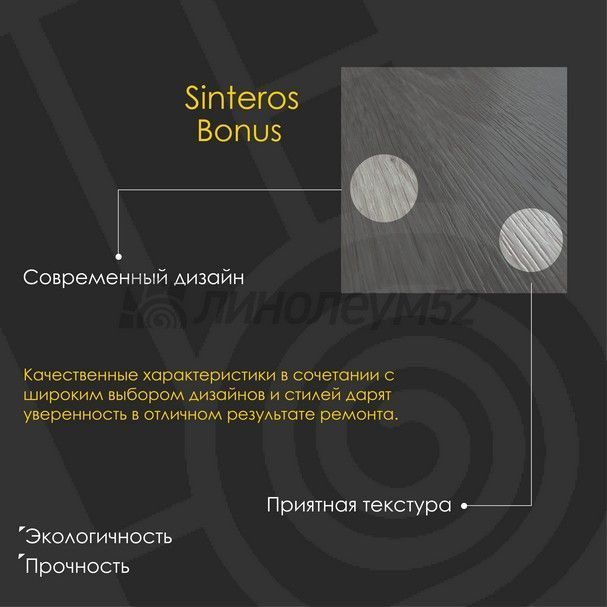 Бренд "SINTEROS" является одним из лидеров на рынке линолеума в России уже на протяжении многих лет. Такое стабильное положение бренд занимает благодаря объективным факторам, среди которых - постоянно совершенствующиеся технологии производства и эксплуатационные характеристики напольных покрытий. Ассортимент бренда "SINTEROS" включает линолеум, а также паркетную доску и ламинат популярных дизайнов. В 2015 году ПВХ-покрытия бренда "SINTEROS" стали обладателем Свидетельства о соответствии высшему уровню качества - "ЗОЛОТОЙ ЗНАК КАЧЕСТВА XXI ВЕКА". Получение такого свидетельства - это дополнительная оценка и подтверждение стремлений компании предлагать качественные, безопасные решения и быть ближе к нашим потребителям. Если у вас остались вопросы, то наши специалисты с радостью помогут найти ответы и примут любой вызов...