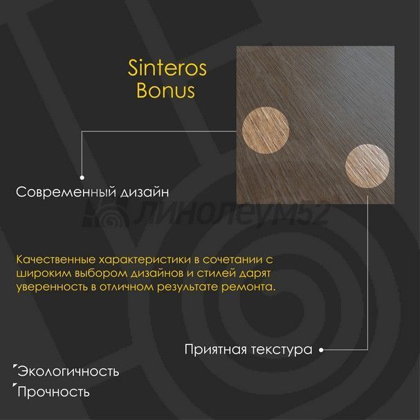 Бренд "SINTEROS" является одним из лидеров на рынке линолеума в России уже на протяжении многих лет. Такое стабильное положение бренд занимает благодаря объективным факторам, среди которых - постоянно совершенствующиеся технологии производства и эксплуатационные характеристики напольных покрытий. Ассортимент бренда "SINTEROS" включает линолеум, а также паркетную доску и ламинат популярных дизайнов. В 2015 году ПВХ-покрытия бренда "SINTEROS" стали обладателем Свидетельства о соответствии высшему уровню качества - "ЗОЛОТОЙ ЗНАК КАЧЕСТВА XXI ВЕКА". Получение такого свидетельства - это дополнительная оценка и подтверждение стремлений компании предлагать качественные, безопасные решения и быть ближе к нашим потребителям. Если у вас остались вопросы, то наши специалисты с радостью помогут найти ответы и примут любой вызов...
