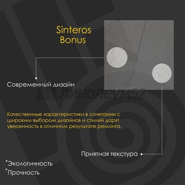 Бренд "SINTEROS" является одним из лидеров на рынке линолеума в России уже на протяжении многих лет. Такое стабильное положение бренд занимает благодаря объективным факторам, среди которых - постоянно совершенствующиеся технологии производства и эксплуатационные характеристики напольных покрытий. Ассортимент бренда "SINTEROS" включает линолеум, а также паркетную доску и ламинат популярных дизайнов. В 2015 году ПВХ-покрытия бренда "SINTEROS" стали обладателем Свидетельства о соответствии высшему уровню качества - "ЗОЛОТОЙ ЗНАК КАЧЕСТВА XXI ВЕКА". Получение такого свидетельства - это дополнительная оценка и подтверждение стремлений компании предлагать качественные, безопасные решения и быть ближе к нашим потребителям. Если у вас остались вопросы, то наши специалисты с радостью помогут найти ответы и примут любой вызов...