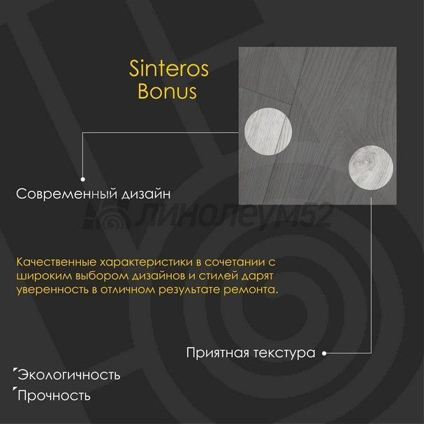 Бренд "SINTEROS" является одним из лидеров на рынке линолеума в России уже на протяжении многих лет. Такое стабильное положение бренд занимает благодаря объективным факторам, среди которых - постоянно совершенствующиеся технологии производства и эксплуатационные характеристики напольных покрытий. Ассортимент бренда "SINTEROS" включает линолеум, а также паркетную доску и ламинат популярных дизайнов. В 2015 году ПВХ-покрытия бренда "SINTEROS" стали обладателем Свидетельства о соответствии высшему уровню качества - "ЗОЛОТОЙ ЗНАК КАЧЕСТВА XXI ВЕКА". Получение такого свидетельства - это дополнительная оценка и подтверждение стремлений компании предлагать качественные, безопасные решения и быть ближе к нашим потребителям. Если у вас остались вопросы, то наши специалисты с радостью помогут найти ответы и примут любой вызов...
