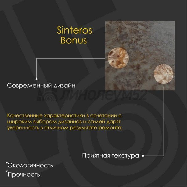 Бренд "SINTEROS" является одним из лидеров на рынке линолеума в России уже на протяжении многих лет. Такое стабильное положение бренд занимает благодаря объективным факторам, среди которых - постоянно совершенствующиеся технологии производства и эксплуатационные характеристики напольных покрытий. Ассортимент бренда "SINTEROS" включает линолеум, а также паркетную доску и ламинат популярных дизайнов. В 2015 году ПВХ-покрытия бренда "SINTEROS" стали обладателем Свидетельства о соответствии высшему уровню качества - "ЗОЛОТОЙ ЗНАК КАЧЕСТВА XXI ВЕКА". Получение такого свидетельства - это дополнительная оценка и подтверждение стремлений компании предлагать качественные, безопасные решения и быть ближе к нашим потребителям. Если у вас остались вопросы, то наши специалисты с радостью помогут найти ответы и примут любой вызов...