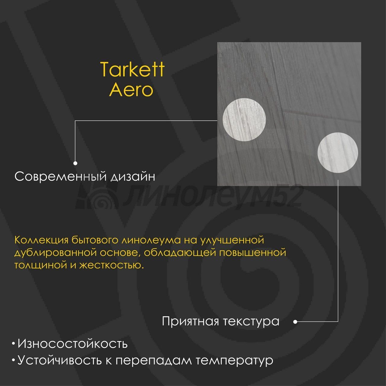 "AERO" - это коллекция бытового линолеума на улучшенной дублированной основе, обладающая повышенной толщиной и жёсткостью. Коллекция создана по специальной технологии, позволяющей сочетать в себе одновременно преимущества продуктов на дублированной и вспененной основах. Покрытие устойчиво к перепадам температур и обладает хорошей износостойкостью, тепло и звукоизолирующими свойствами. "TARKETT" находится в постоянном сотрудничестве с архитекторами...