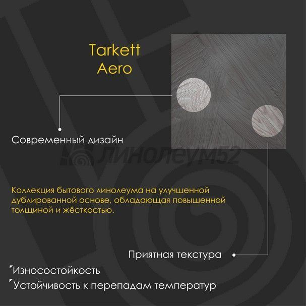 "AERO" - это коллекция бытового линолеума на улучшенной дублированной основе, обладающая повышенной толщиной и жёсткостью. Коллекция создана по специальной технологии, позволяющей сочетать в себе одновременно преимущества продуктов на дублированной и вспененной основах. Покрытие устойчиво к перепадам температур и обладает хорошей износостойкостью, тепло и звукоизолирующими свойствами. "TARKETT" находится в постоянном сотрудничестве с архитекторами...