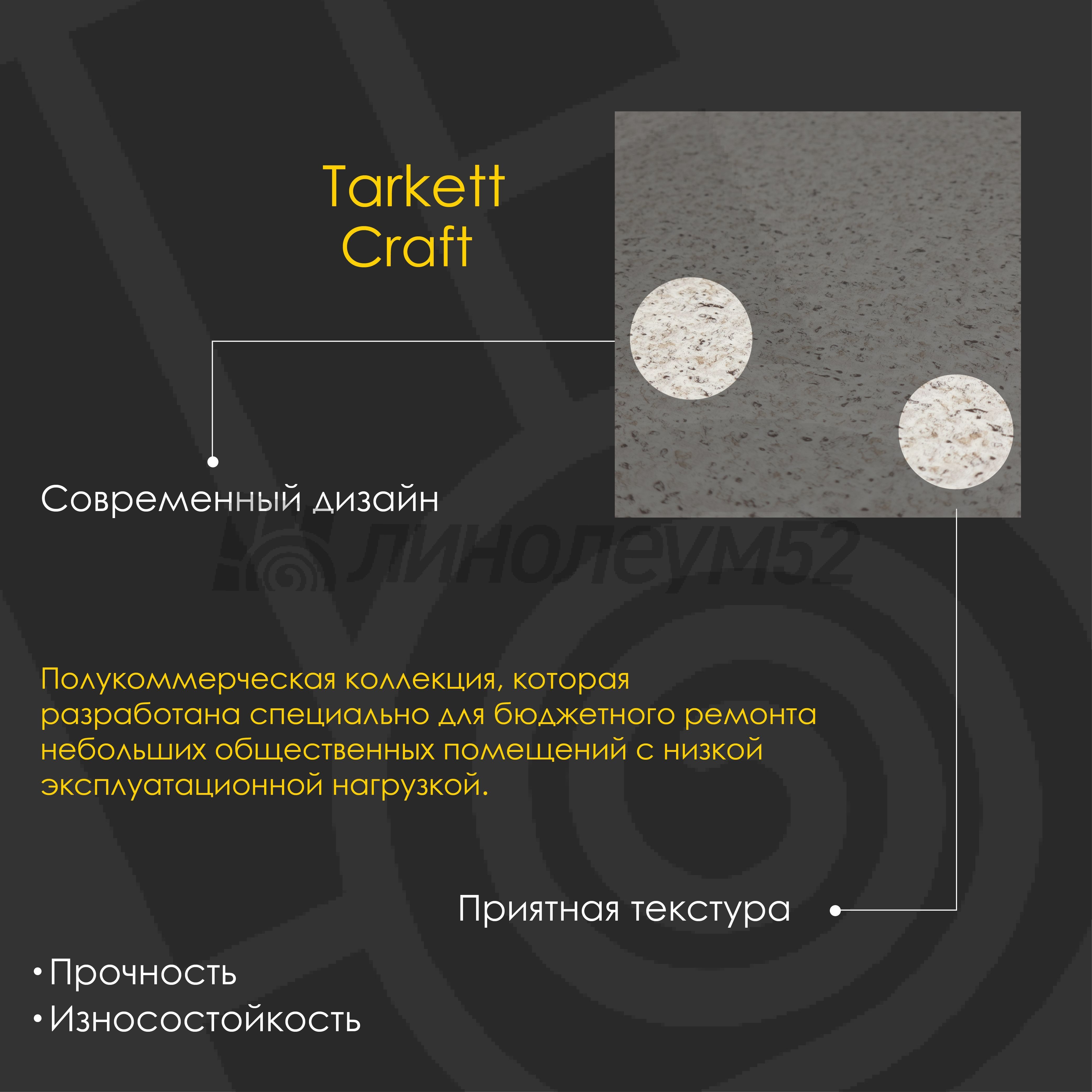"CRAFT" - это основа из компактной пены в сочетании с самыми ходовыми оттенками сезона отныне пополнили ассортимент "TARKETT". Широкая линейка продуктов (ПВХ-покрытия, а ещё ламинат и паркет) и совершенный выбор дизайнов позволят создать индивидуальный стиль для каждого интерьера. "TARKETT" находится в постоянном сотрудничестве с архитекторами, проектировщиками и дизайнерами, а также управляющими компаниями, стремясь принести комфорт в разные помещения...