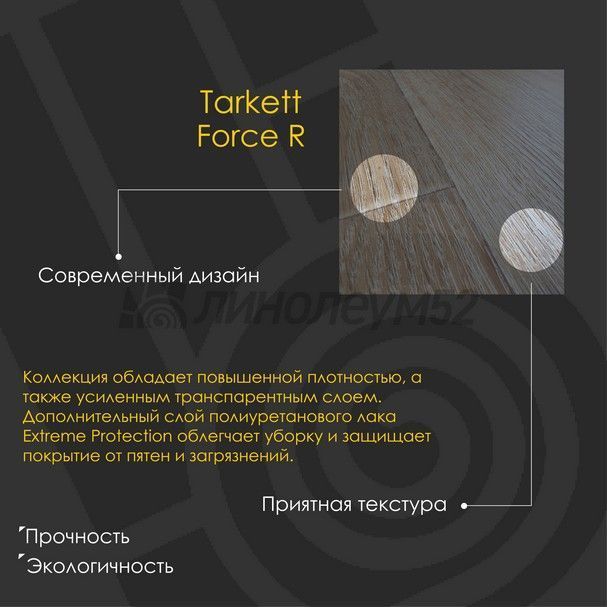 Уникальное сочетание высокой плотности и прочности с качественными универсальными дизайнами сделали "FORCE R" одним из самых популярных покрытий для дома и офиса. Нейтральная абстракция и прохладный на вид мрамор или по настоящему живое, тёплое дерево во всем многообразии расцветок коллекции позволяют создать свой собственный, уникальный интерьер, а защитный слой "EXTREME PTOTECTION" добавит спокойствие на долгие года. "FORCE" - воплощение силы для любых помещении...