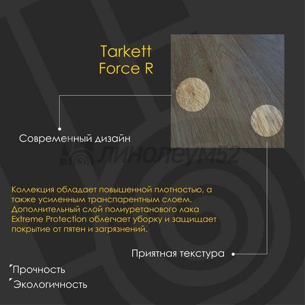 Уникальное сочетание высокой плотности и прочности с качественными универсальными дизайнами сделали "FORCE R" одним из самых популярных покрытий для дома и офиса. Нейтральная абстракция и прохладный на вид мрамор или по настоящему живое, тёплое дерево во всем многообразии расцветок коллекции позволяют создать свой собственный, уникальный интерьер, а защитный слой "EXTREME PTOTECTION" добавит спокойствие на долгие года. "FORCE" - воплощение силы для любых помещении...