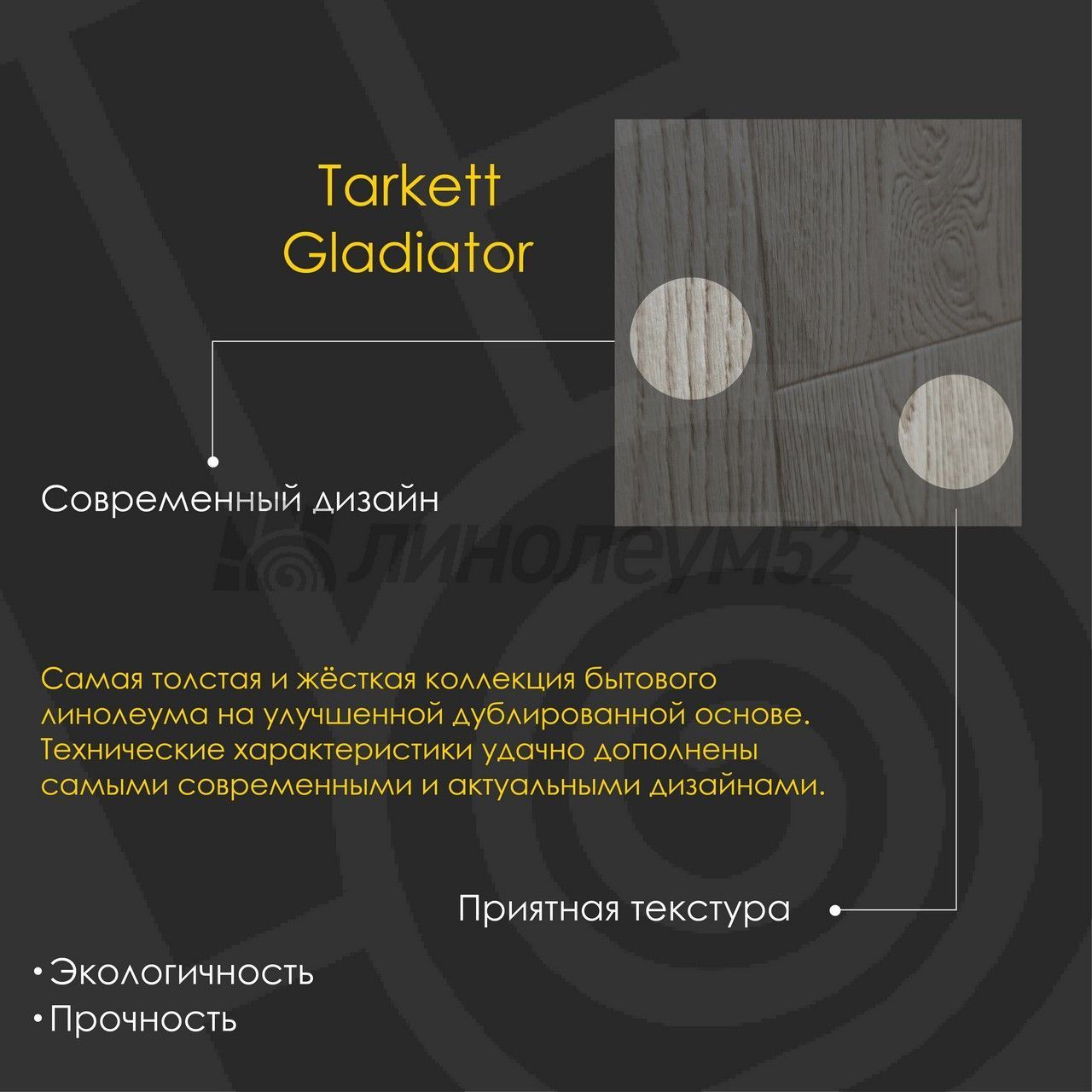 "GLADIATOR" - это самая толстая и жёсткая коллекция бытового линолеума на улучшенной дублированной основе в ассортименте "TARKETT". Широкая линейка продуктов (ПВХ-покрытия, а ещё ламинат и паркет) и большим выбором дизайнов позволят создать индивидуальный стиль для каждого интерьера. "TARKETT" находится в постоянном сотрудничестве с архитекторами, проектировщиками и дизайнерами, а также управляющими компаниями, стремясь принести комфорт в любые помещения...