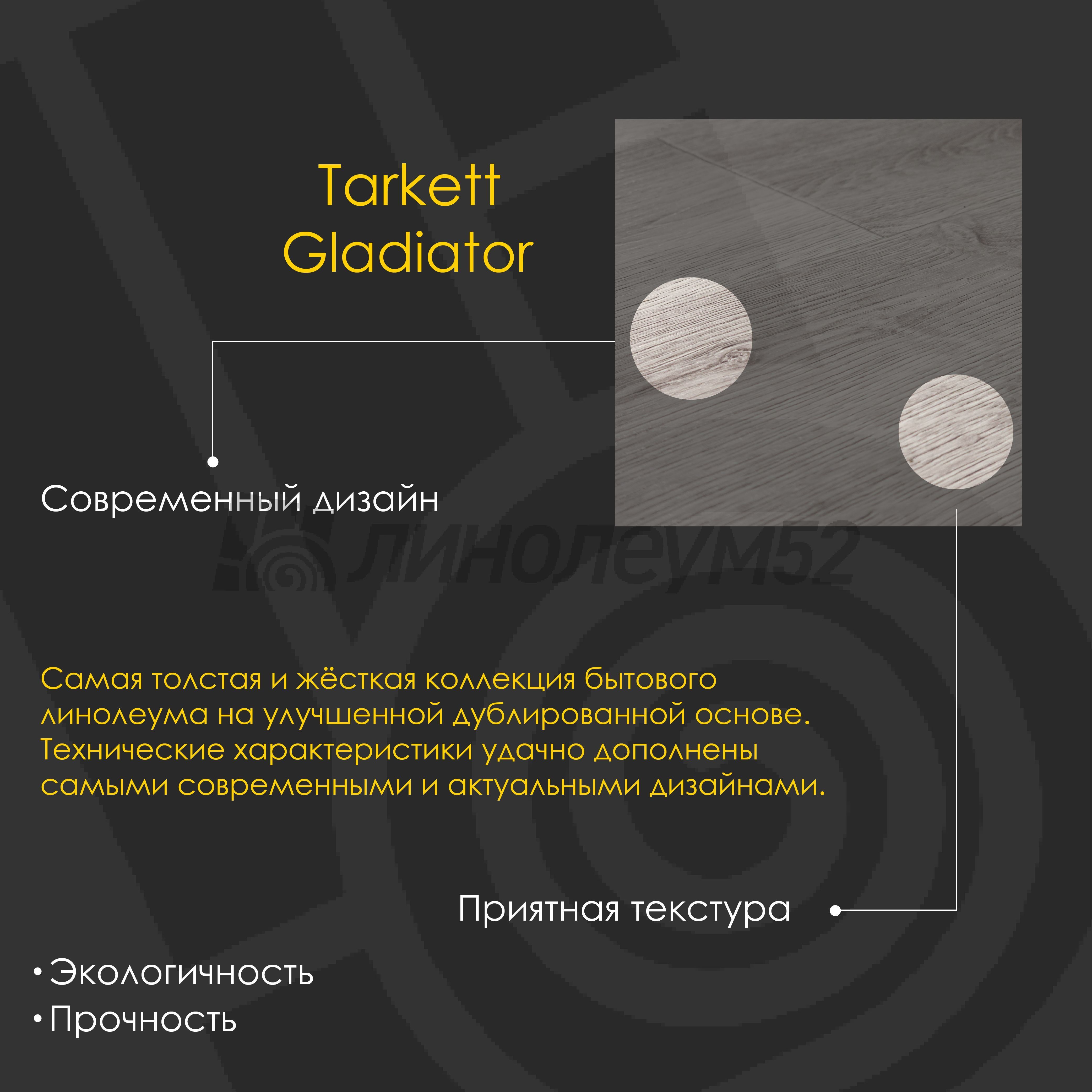 "GLADIATOR" - это самая толстая и жёсткая коллекция бытового линолеума на улучшенной дублированной основе в ассортименте "TARKETT". Широкая линейка продуктов (ПВХ-покрытия, а ещё ламинат и паркет) и большим выбором дизайнов позволят создать индивидуальный стиль для каждого интерьера. "TARKETT" находится в постоянном сотрудничестве с архитекторами, проектировщиками и дизайнерами, а также управляющими компаниями, стремясь принести комфорт в любые помещения...