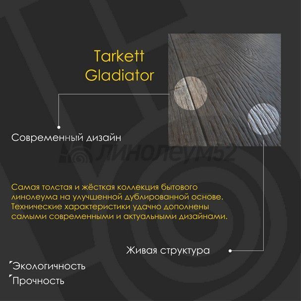 "GLADIATOR" - это самая толстая и жёсткая коллекция бытового линолеума на улучшенной дублированной основе в ассортименте "TARKETT". Широкая линейка продуктов (ПВХ-покрытия, а ещё ламинат и паркет) и большим выбором дизайнов позволят создать индивидуальный стиль для каждого интерьера. "TARKETT" находится в постоянном сотрудничестве с архитекторами, проектировщиками и дизайнерами, а также управляющими компаниями, стремясь принести комфорт в любые помещения...