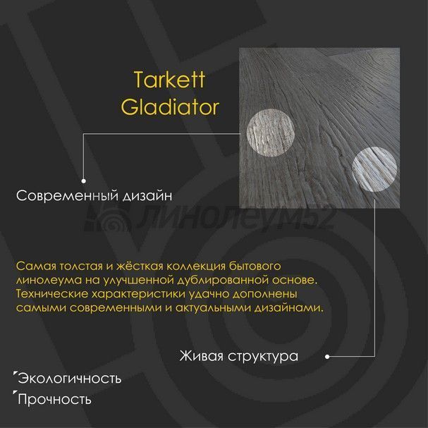 "GLADIATOR" - это самая толстая и жёсткая коллекция бытового линолеума на улучшенной дублированной основе в ассортименте "TARKETT". Широкая линейка продуктов (ПВХ-покрытия, а ещё ламинат и паркет) и большим выбором дизайнов позволят создать индивидуальный стиль для каждого интерьера. "TARKETT" находится в постоянном сотрудничестве с архитекторами, проектировщиками и дизайнерами, а также управляющими компаниями, стремясь принести комфорт в любые помещения...