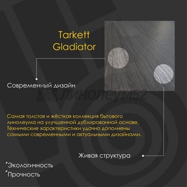 "GLADIATOR" - это самая толстая и жёсткая коллекция бытового линолеума на улучшенной дублированной основе в ассортименте "TARKETT". Широкая линейка продуктов (ПВХ-покрытия, а ещё ламинат и паркет) и большим выбором дизайнов позволят создать индивидуальный стиль для каждого интерьера. "TARKETT" находится в постоянном сотрудничестве с архитекторами, проектировщиками и дизайнерами, а также управляющими компаниями, стремясь принести комфорт в любые помещения...