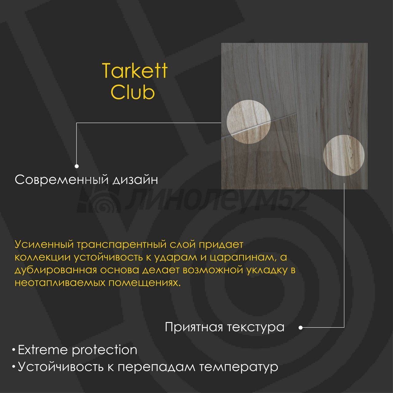 Невероятная прочность и дополнительная текстильная основа делают эту коллекцию настоящей королевой дома. Судите сами - по этому покрытию приятно пройтись босиком, ему не страшны шпильки обуви и модная мебель с острыми ножками, а улучшенные тепло и звукоизоляция позаботятся о комфорте ваших соседей. Дополнительная текстильная основа дарит этому покрытию еще один плюс - стойкость к перепадам температур. "CLUB" - самое современное напольное покрытие...