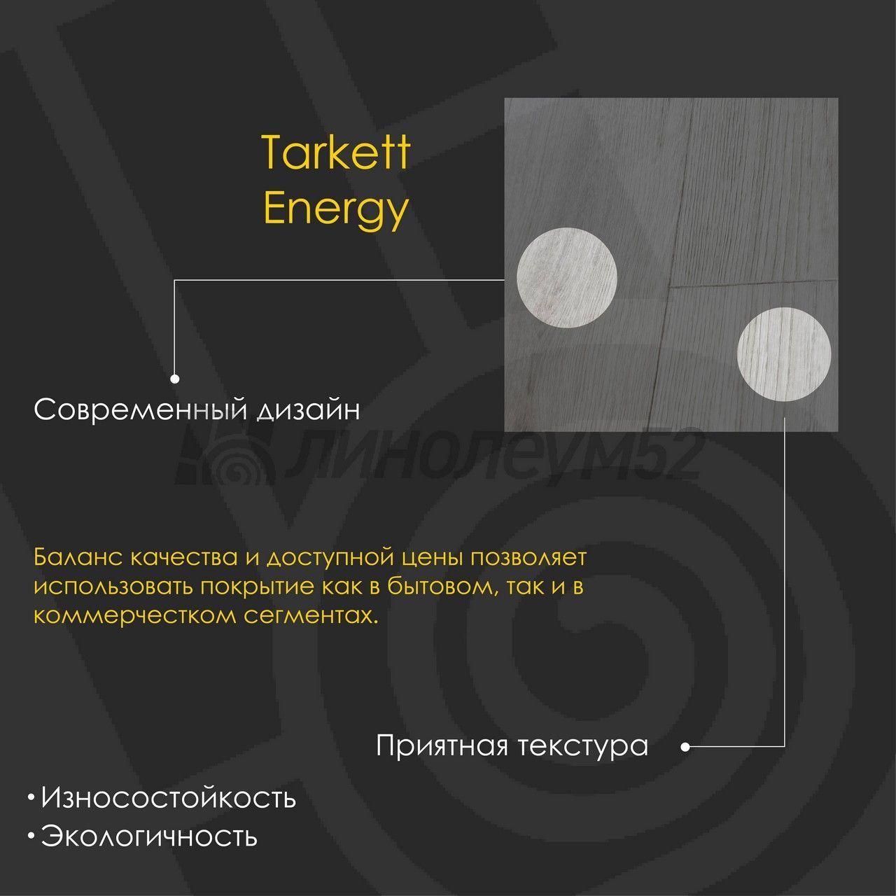 Коллекция "ENERGY" - это баланс качества и доступной цены позволяет использовать покрытие как в бытовом, так и в коммерческом сегментах. "TARKETT" находится в постоянном сотрудничестве с архитекторами, проектировщиками, а также дизайнерами и управляющими компаниями, стремясь сделать жизнь людей комфортнее. "ENERGY" - это коллекция, которая заряжена энергией на все 1000%...