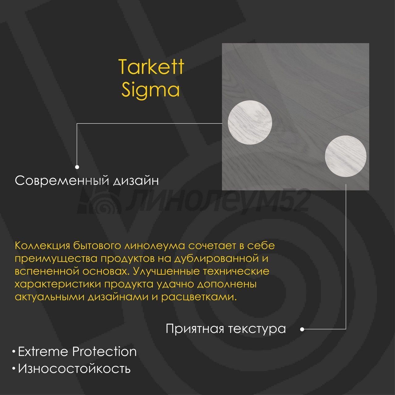 Коллекция бытового линолеума "SIGMA" сочетает в себе преимущества продуктов на дублированной и вспененной основах. Улучшенные технические характеристики продукта удачно дополнены актуальными дизайнами и расцветками, а технология "Живая структура" придает поверхности максимальное сходство с натуральными материалами. "TARKETT" находится в постоянном сотрудничестве с архитекторами, проектировщиками, дизайнерами и управляющими компаниями, стремясь сделать жизнь людей комфортнее. Имея огромный выбор напольных покрытий, "TARKETT" предлагает решения для различного рода зданий, помещений и общественных зон. Широкая линейка продуктов и очень большой выбор дизайнов позволят создать индивидуальный стиль для каждого интерьера. Если у вас остались вопросы, то наши специалисты с лёгкостью помогут найти все ответы...