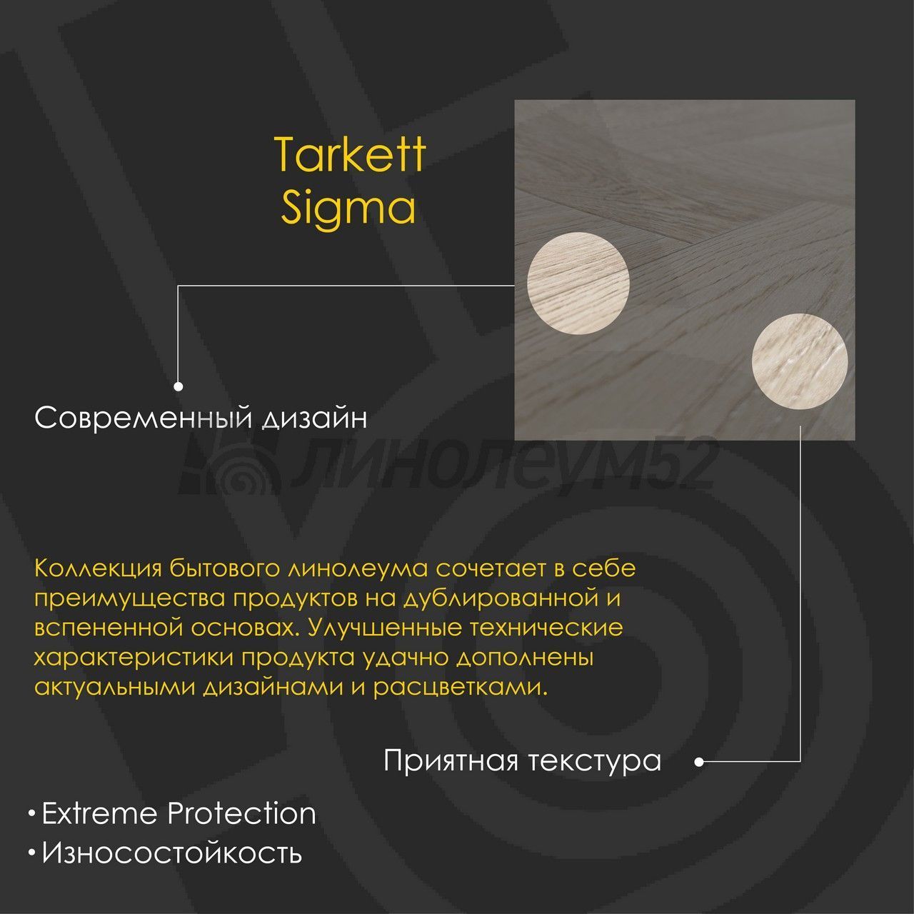Коллекция бытового линолеума "SIGMA" сочетает в себе преимущества продуктов на дублированной и вспененной основах. Улучшенные технические характеристики продукта удачно дополнены актуальными дизайнами и расцветками, а технология "Живая структура" придает поверхности максимальное сходство с натуральными материалами. "TARKETT" находится в постоянном сотрудничестве с архитекторами, проектировщиками, дизайнерами и управляющими компаниями, стремясь сделать жизнь людей комфортнее. Имея огромный выбор напольных покрытий, "TARKETT" предлагает решения для различного рода зданий, помещений и общественных зон. Широкая линейка продуктов и очень большой выбор дизайнов позволят создать индивидуальный стиль для каждого интерьера. Если у вас остались вопросы, то наши специалисты с лёгкостью помогут найти все ответы...