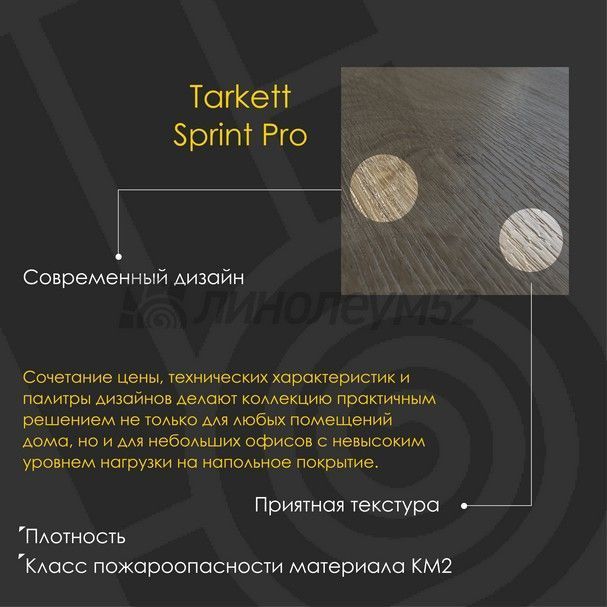 Удачное сочетание цены, технических характеристик и палитры дизайнов делают "SPRINT PRO" по настоящему практичным решением не только для любых помещений дома, но и для небольших офисов с невысоким уровнем нагрузки на напольное покрытие. А одна из самых широких в ассортименте бренда "TARKETT" линейка ширин позволяет легко подобрать нужный вариант для конкретного помещения, обеспечивая одновременно реализацию идеи дизайнера в помещении и экономичность...