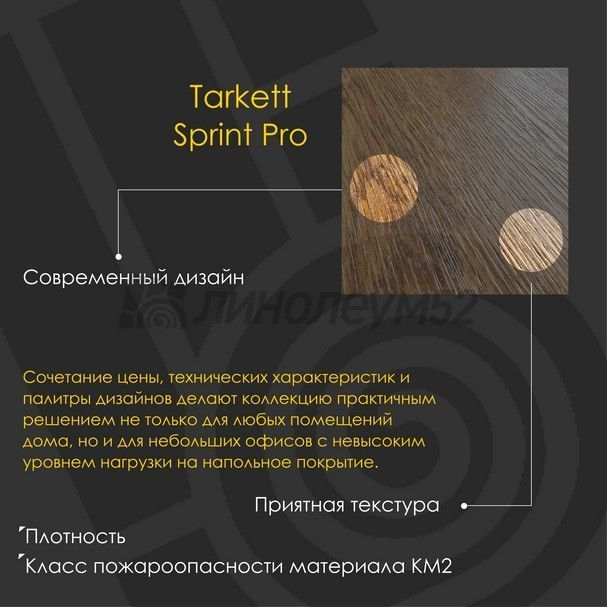 Удачное сочетание цены, технических характеристик и палитры дизайнов делают "SPRINT PRO" по настоящему практичным решением не только для любых помещений дома, но и для небольших офисов с невысоким уровнем нагрузки на напольное покрытие. А одна из самых широких в ассортименте бренда "TARKETT" линейка ширин позволяет легко подобрать нужный вариант для конкретного помещения, обеспечивая одновременно реализацию идеи дизайнера в помещении и экономичность...