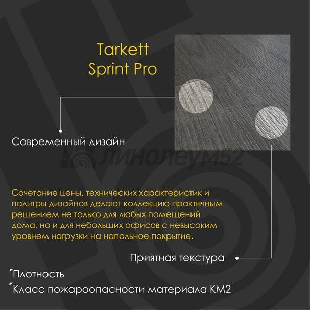Удачное сочетание цены, технических характеристик и палитры дизайнов делают "SPRINT PRO" по настоящему практичным решением не только для любых помещений дома, но и для небольших офисов с невысоким уровнем нагрузки на напольное покрытие. А одна из самых широких в ассортименте бренда "TARKETT" линейка ширин позволяет легко подобрать нужный вариант для конкретного помещения, обеспечивая одновременно реализацию идеи дизайнера в помещении и экономичность...