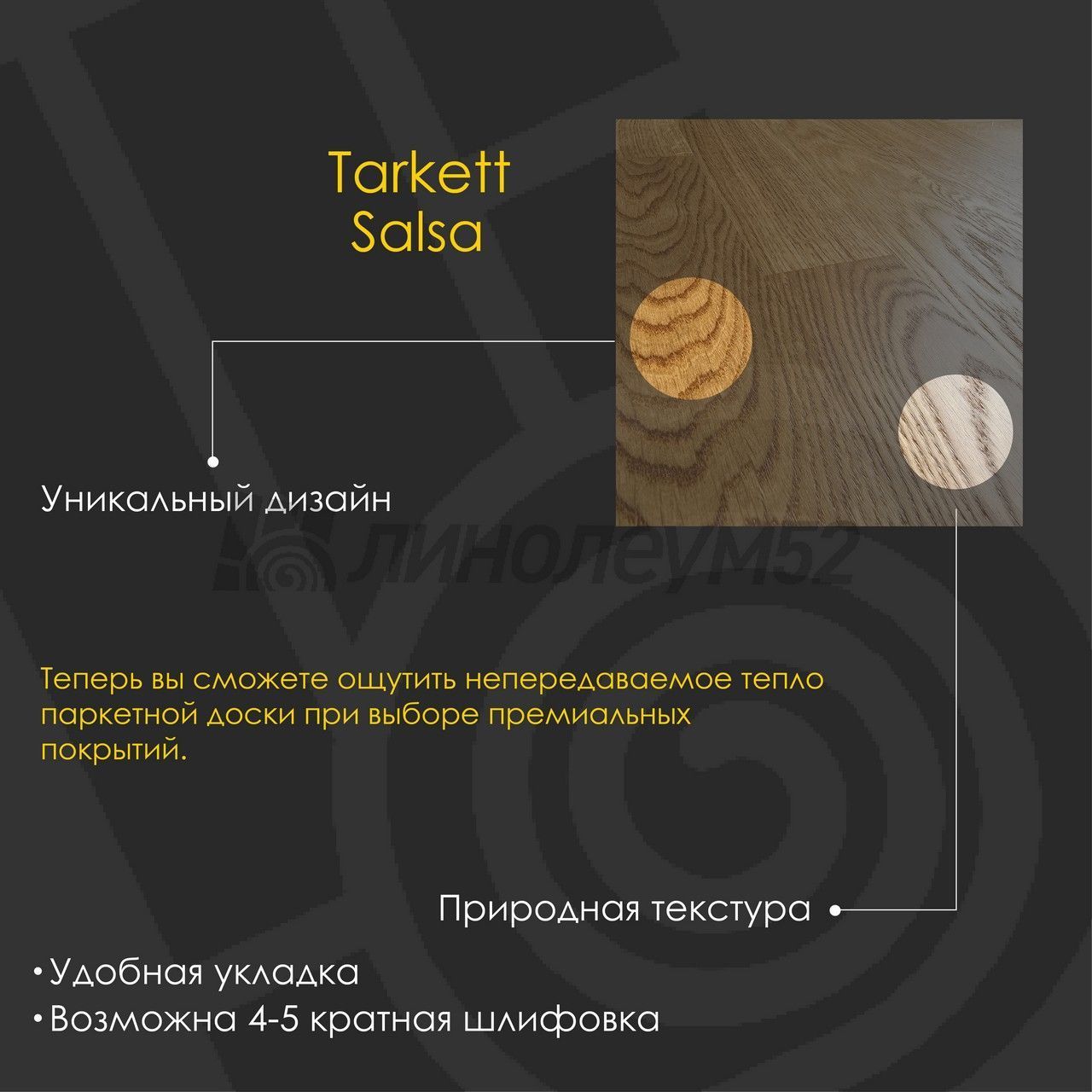 Уникальные свойства: Подходит для пола с подогревом +27°С / Продажа товара отпускается в упаковках / Экономичный выбор для покупателей