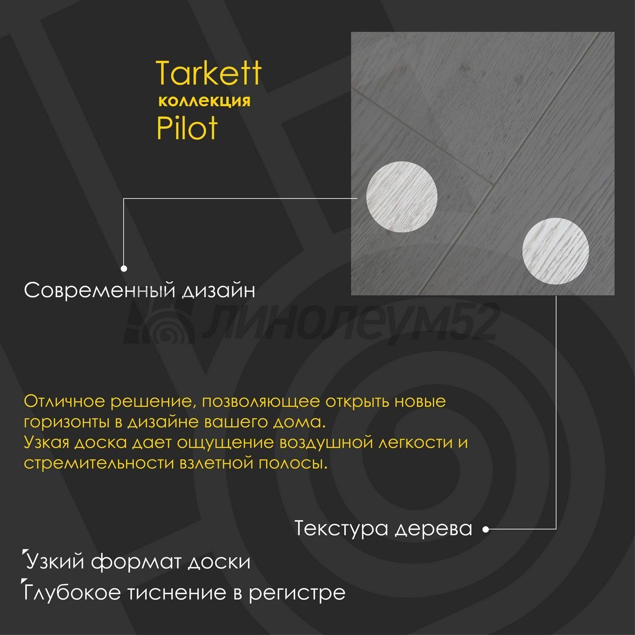 Чтобы летать быстрее всех, нужно летать быстрее себя. Поэтому мы изменили правила! Коллекция "PILOT 10/33 4V" - это новаторское решение, позволяющее открыть новые горизонты в дизайне вашего дома. Узкая доска дает ощущение воздушной легкости и стремительности взлетной полосы. "TARKETT" находится в постоянном сотрудничестве с архитекторами, проектировщиками, дизайнерами и управляющими компаниями, стремясь сделать жизнь людей комфортнее. Имея огромный выбор напольных покрытий, "TARKETT" предлагает решения для различного рода зданий, помещений и общественных зон. Широкая линейка продуктов (ПВХ-покрытия, ламинат, паркет) и большой выбор дизайнов позволят создать индивидуальный стиль для каждого интерьера. Если у вас остались вопросы, то наши специалисты с радостью помогут вам найти ответы на них. Готовим взлётную полосу...