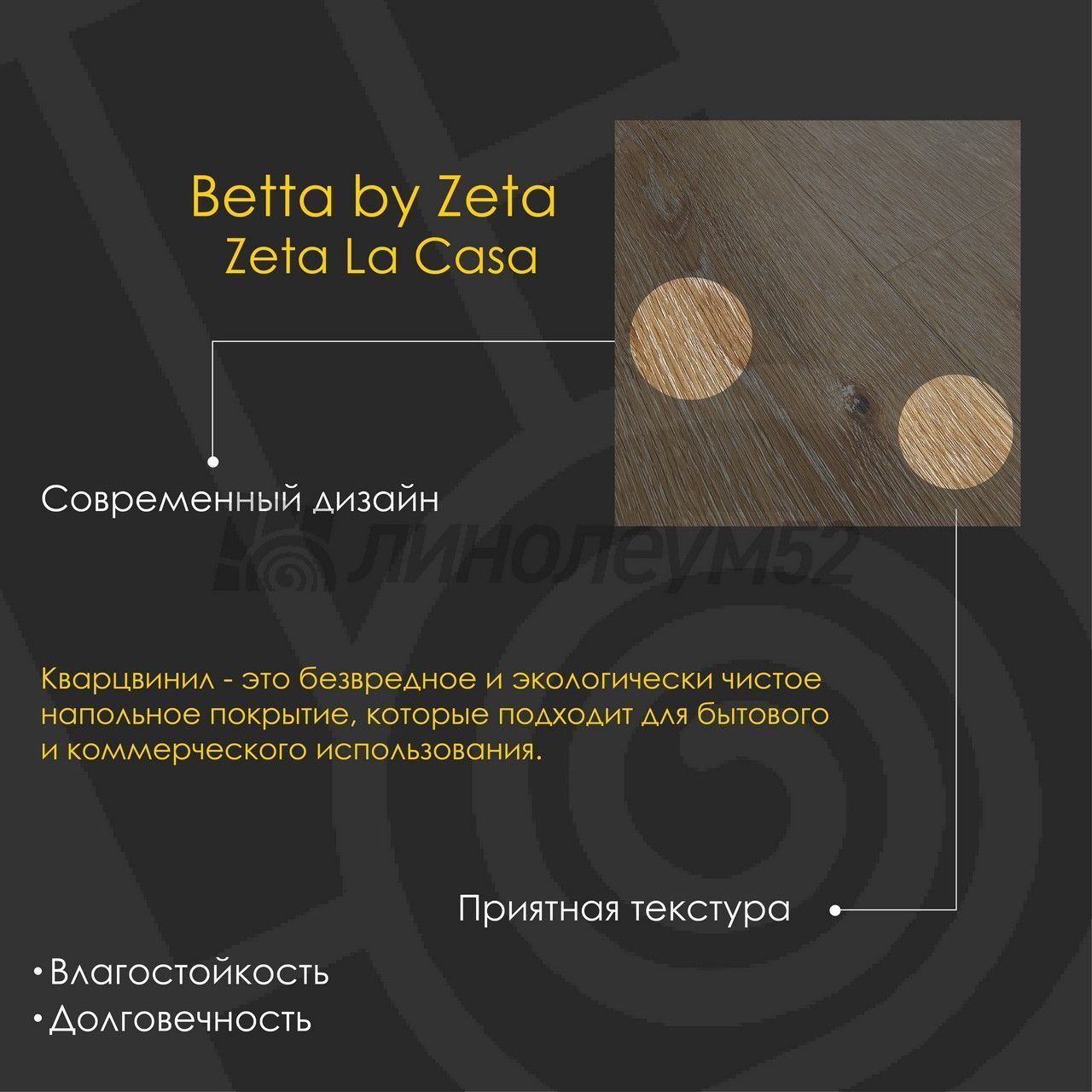 | Уникальные свойства: | Подходит для пола с подогревом +27°С / Продажа товара отпускается в упаковках / Уникальный стиль / Экологичность / Экономичный выбор для покупателей |