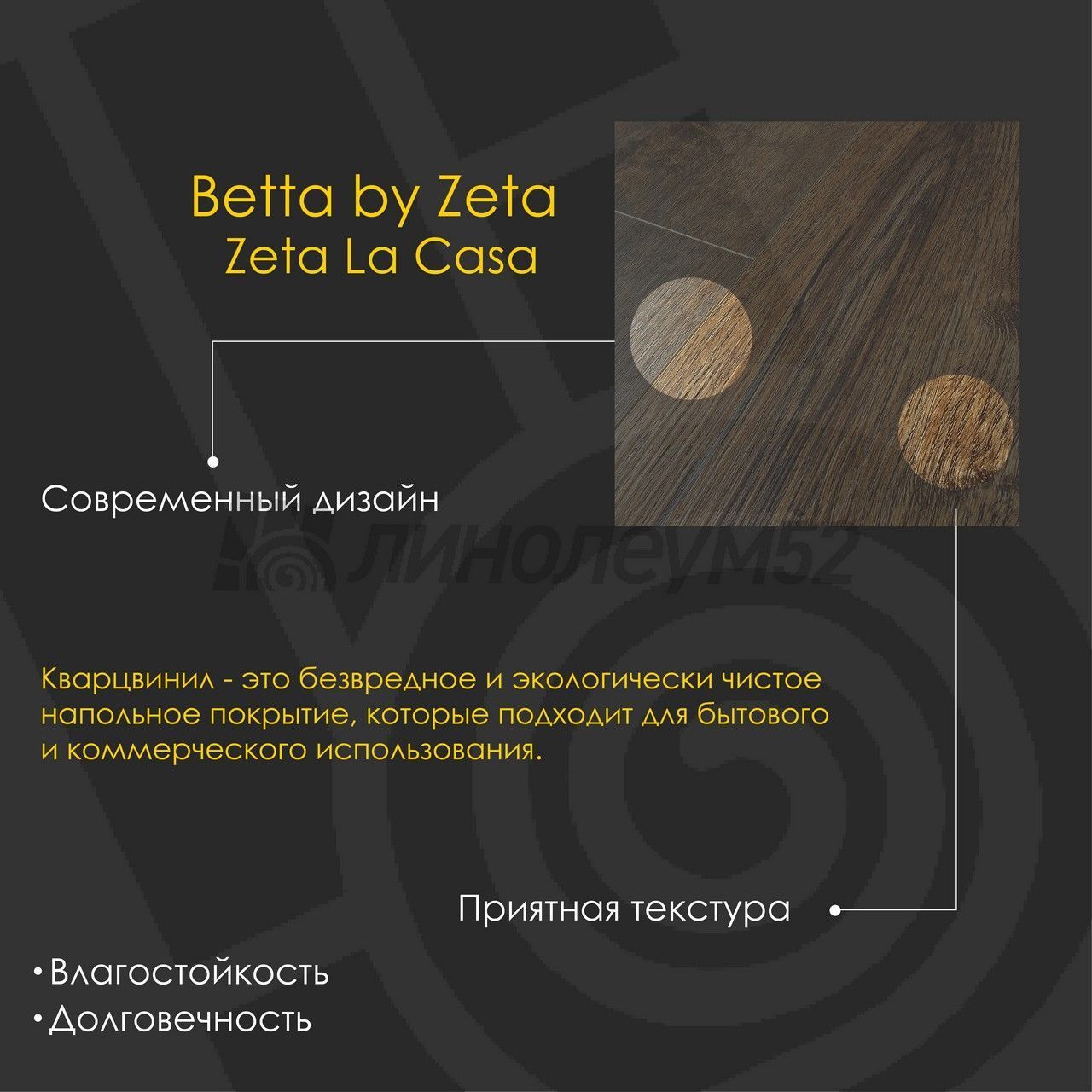 | Уникальные свойства: | Подходит для пола с подогревом +27°С / Продажа товара отпускается в упаковках / Уникальный стиль / Экологичность / Экономичный выбор для покупателей |