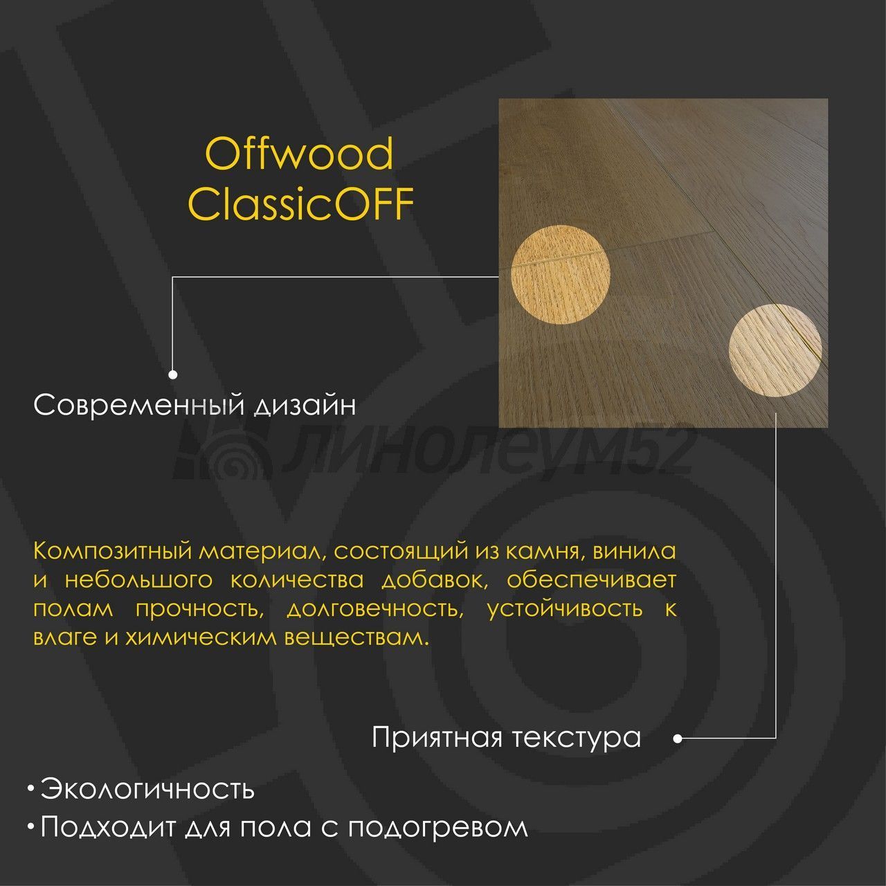 OFFWOOD ClassicOFF — полимерный пол, в основе которого лежит минерально-полимерная плита SPC. Композитный материал, состоящий из камня, винила и небольшого количества добавок, обеспечивает полам прочность, долговечность, устойчивость к влаге и химическим веществам. Толщина ламината составляет 4 мм — он подходит для коммерческих помещений с высокой проходимостью и жилых пространств, где требуется повышенная износостойкость покрытия. Класс пожарной опасности КМ2 подтверждает его безопасность и экологичность. Верхний слой толщиной 0,5 мм обеспечивает защиту от царапин, потертостей и других механических повреждений, значительно продлевая срок службы ламината. Дизайны под дерево придают ламинату OFFWOOD ClassicOFF особую эстетику, позволяя гармонично сочетать его с любым интерьером.