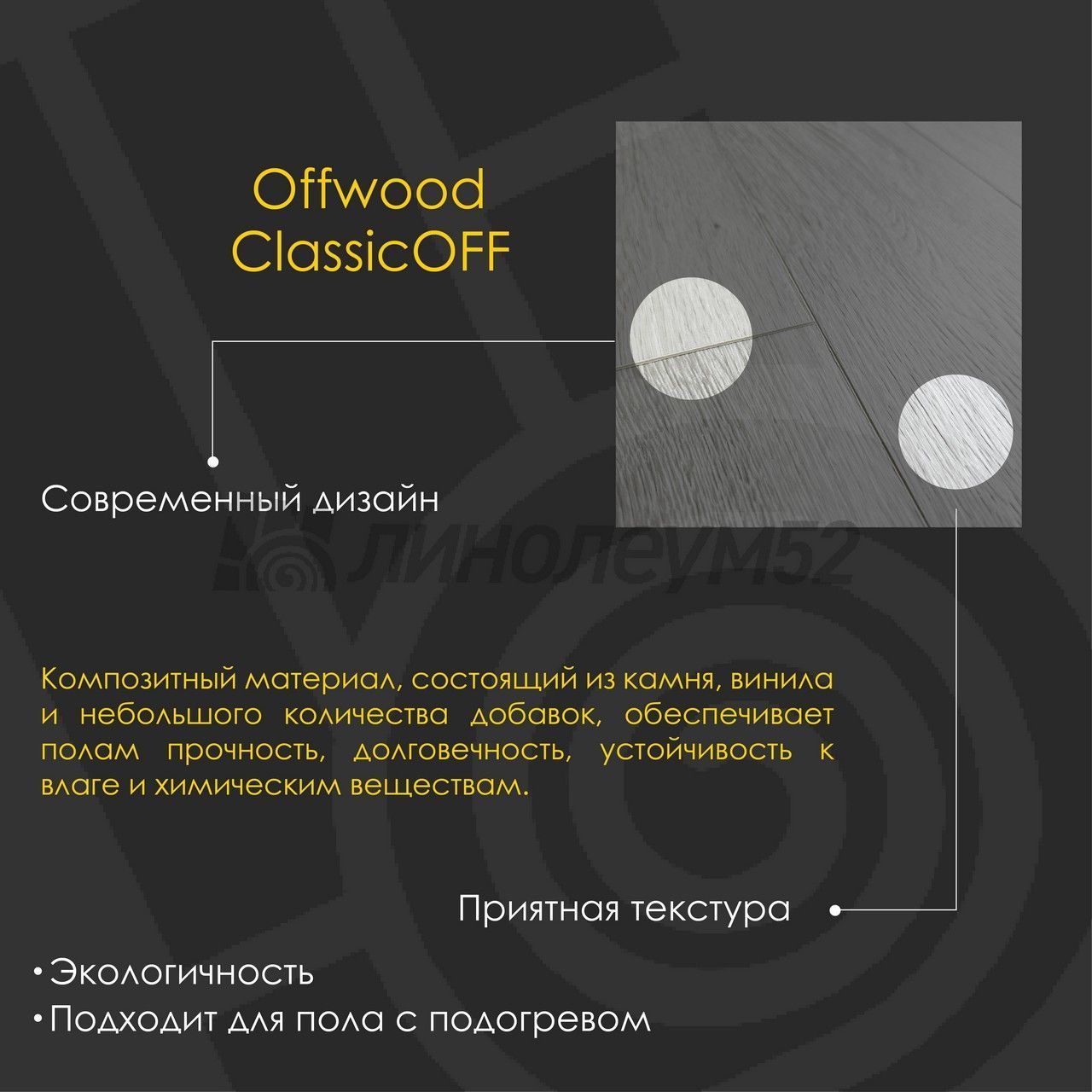 OFFWOOD ClassicOFF — полимерный пол, в основе которого лежит минерально-полимерная плита SPC. Композитный материал, состоящий из камня, винила и небольшого количества добавок, обеспечивает полам прочность, долговечность, устойчивость к влаге и химическим веществам. Толщина ламината составляет 4 мм — он подходит для коммерческих помещений с высокой проходимостью и жилых пространств, где требуется повышенная износостойкость покрытия. Класс пожарной опасности КМ2 подтверждает его безопасность и экологичность. Верхний слой толщиной 0,5 мм обеспечивает защиту от царапин, потертостей и других механических повреждений, значительно продлевая срок службы ламината. Дизайны под дерево придают ламинату OFFWOOD ClassicOFF особую эстетику, позволяя гармонично сочетать его с любым интерьером.